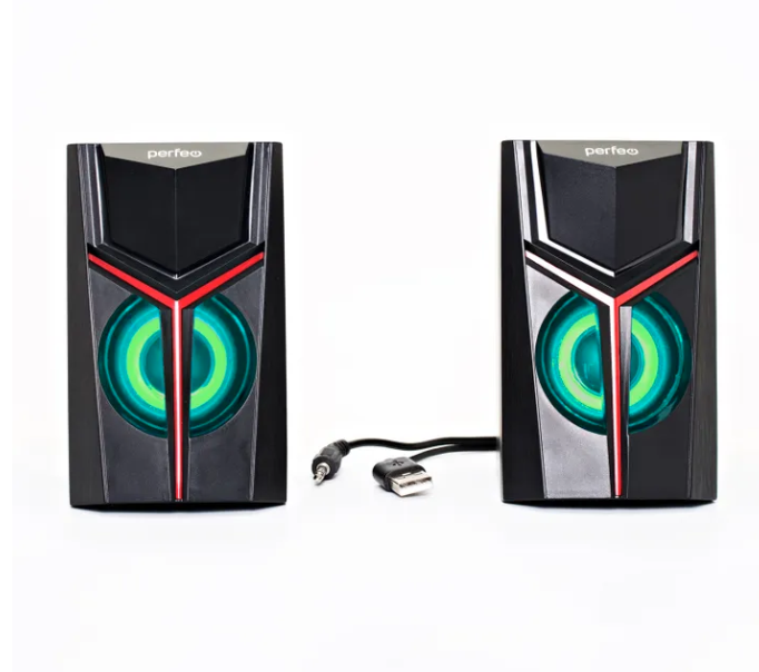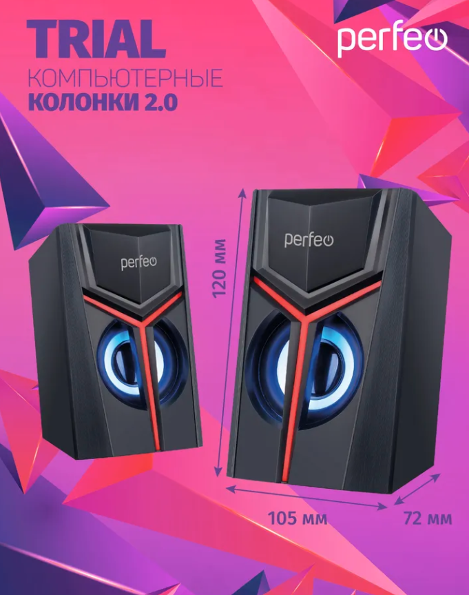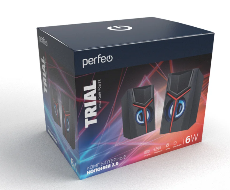 Описание Колонки Perfeo 2.0 "TRIAL", мощность 2х3 Вт, USB, чёрн, Game Design, LED подсветка 7 цв