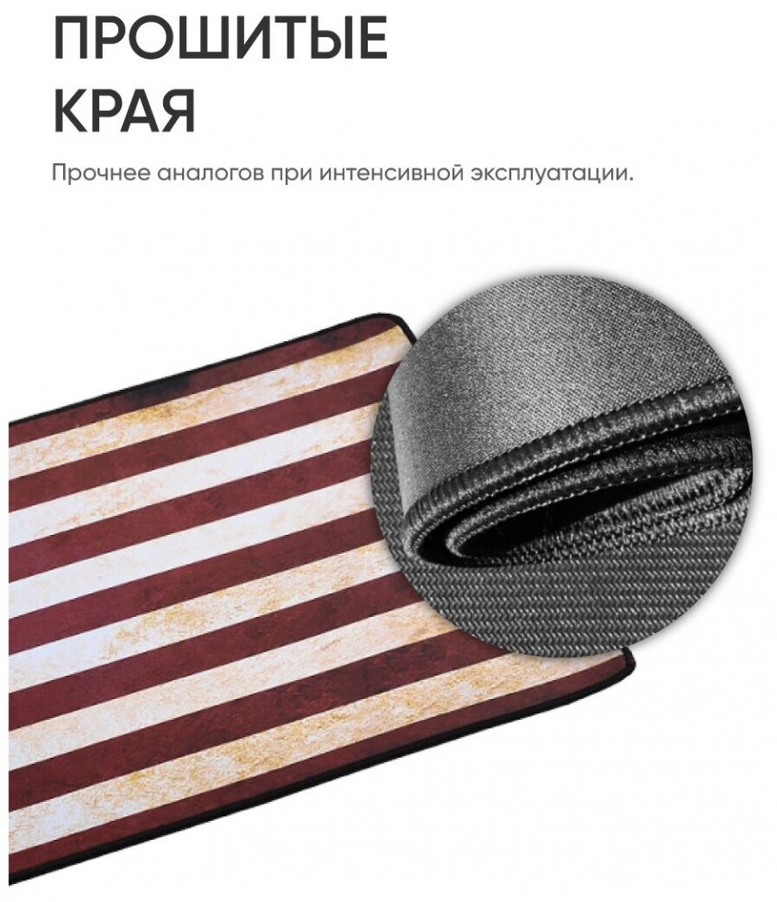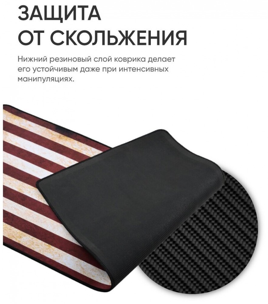 Повысит эргономичность рабочего пространства, обеспечит комфортную работу с компьютерной мышью и защитит поверхность рабочего стола от трения мыши/клавиатуры. Основные преимущества коврика: минимальная толщина всех износостойких слоев (не менее 3 мм); обмётка коврика нитью, не позволяет расслаиваться краям; в производстве используется высококачественное тканевое покрытие, придающее четкое реагирование мыши при ее передвижении, а резиновая рифлёная подкладка предотвратит скольжение коврика по столу.