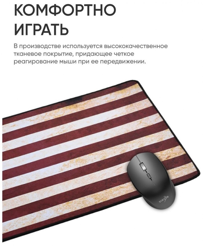 Коврик для мышки Vixion MP18 идеально подходит любителям компьютерных игр, а также тем, кто работает с графическими программами. Покрыт гладкой прочной тканью, она обеспечит идеальное скольжение и мгновенный отклик на любые команды. Резиновая основа плотно прилегает к столешнице, дает хорошее сцепление со столом и высокую скорость движения мышки, а прошитые края повышают долговечность аксессуара. Крупноформатный коврик (700x300х3 мм) обеспечит комфортную игру на любой поверхности стола, на нем легко поместится не только мышь, но и ваша клавиатура или ноутбук. Аксессуар неприхотлив в уходе, а его стильный дизайн украсит интерьер любого рабочего места, подойдет для всех видов мышек.