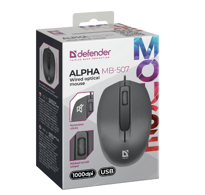 Мышь оптическая DEFENDER Alpha MB-507, черный, 3D,бесшумная,1,8м
