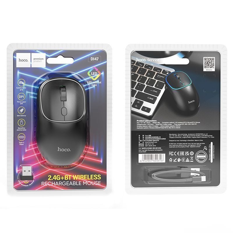 Описание Мышь беспроводная HOCO DI47, Bluetooth, аккумулятор, подсветка (черный) беззвучная