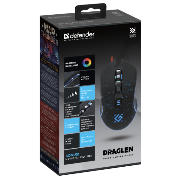 Описание Мышь оптическая DEFENDER Draglen GM-907 проводная, игровая черная