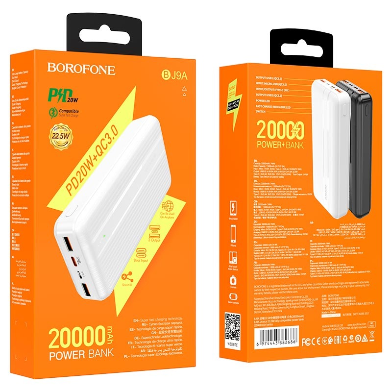 Внешний аккумулятор 20 000 mAh BOROFONE BJ9A (2USB QC3.0/PD 20W/Micro/LED инд. бат) белый