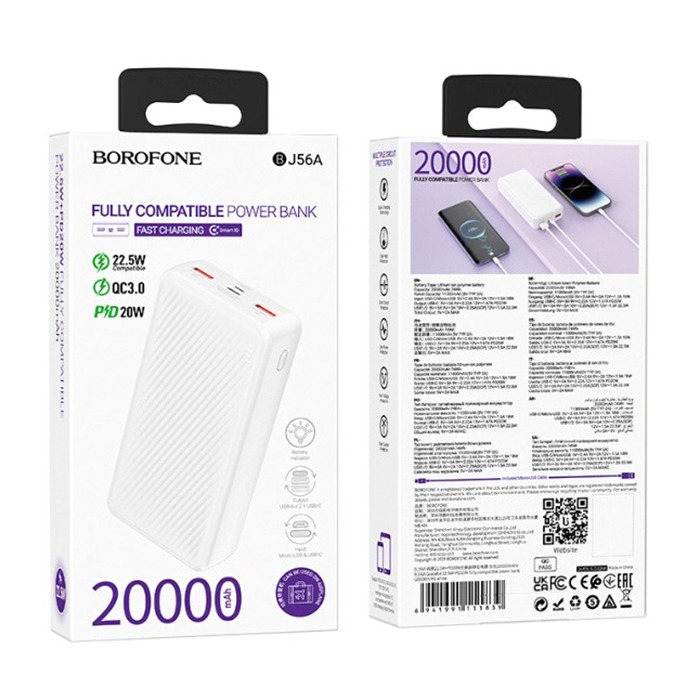 Внешний аккумулятор BOROFONE BJ56A 20 000 mAh (2USB QC 3.0/PD 20W/LED инд) белый