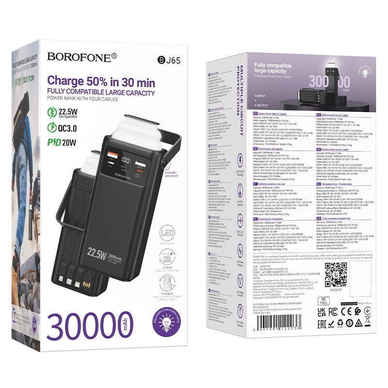 Внешний аккумулятор BOROFONE BJ65 30 000 mAh (2USB QC 3.0/PD 20W/фонарик/три кабеля/дисплей) черный