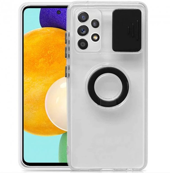 Чехол силиконовый Samsung A72 прозрачный с кольцом и защитой на камеру черный*