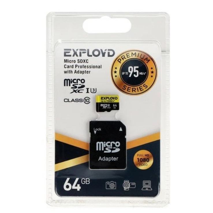 Описание 64Гб карта памяти Exployd microSD + SD адаптер class10 UHS-1
