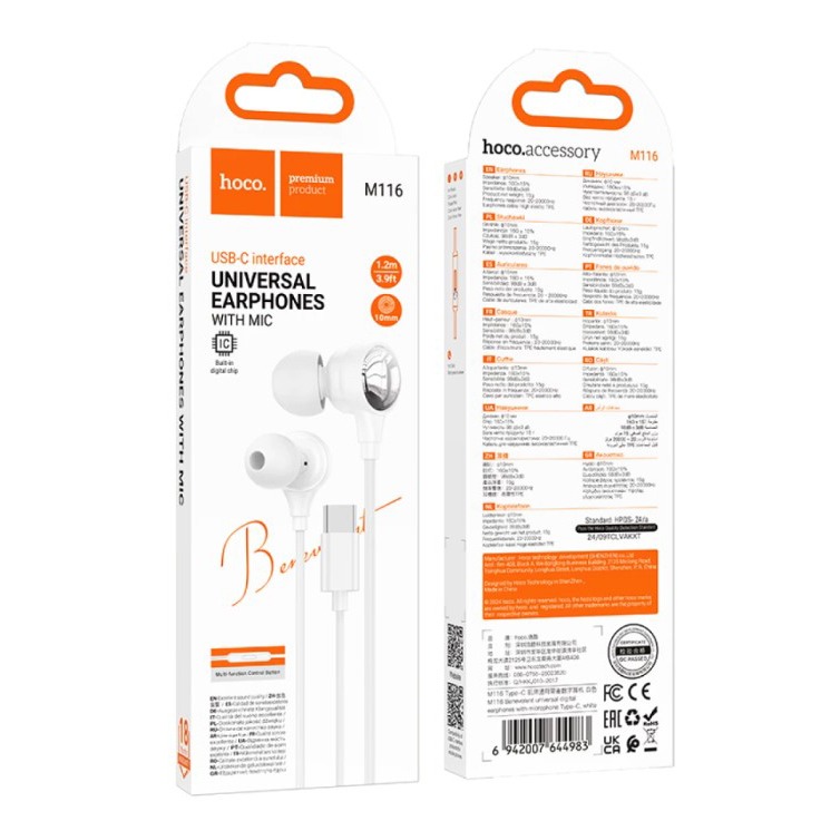 Проводные наушники Type-C HOCO M116 белые