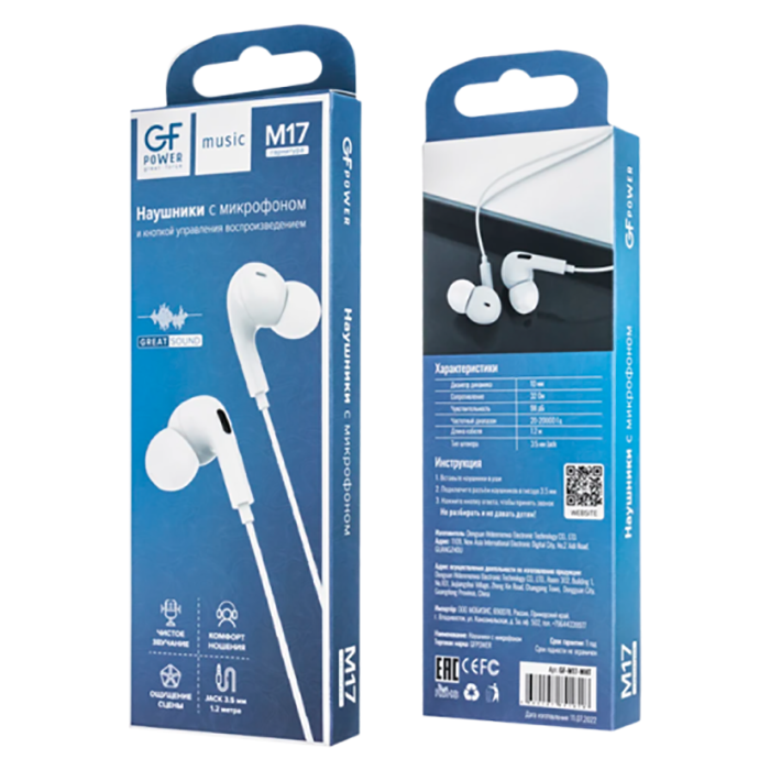 Наушники внутриканальные GFPower M17 с микр. белый (1/200/800)