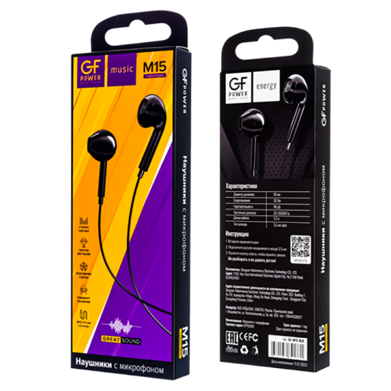 Наушники вставные GFPower M15 с микр. черный (1/200/800)