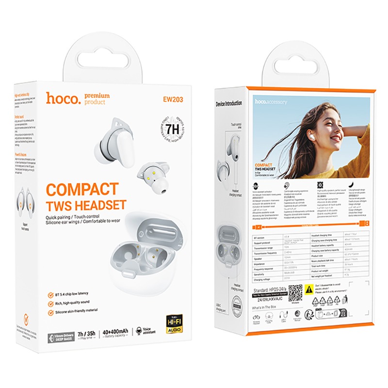 Наушники внутриканальные HOCO EW203 Jinny, пластик, bluetooth 5.4, микрофон, цвет: белый (1/11/110)