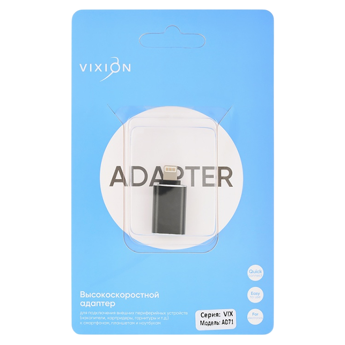 Все характеристикиОписание Адаптер VIXION (AD71) USB 3.0 - Lightning (черный)