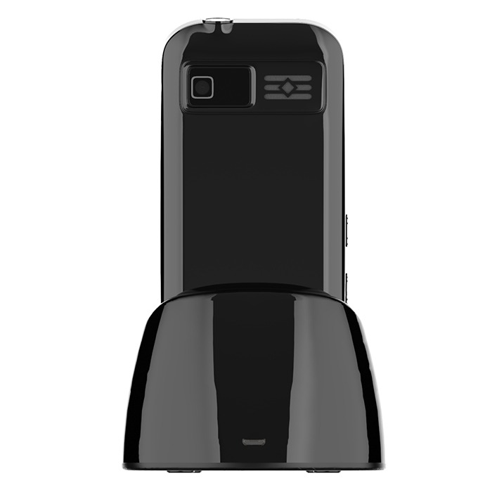Удобный телефон с громким динамиком, большими клавишами, крупным шрифтом, кнопкой SOS и док-станцией в комплекте.