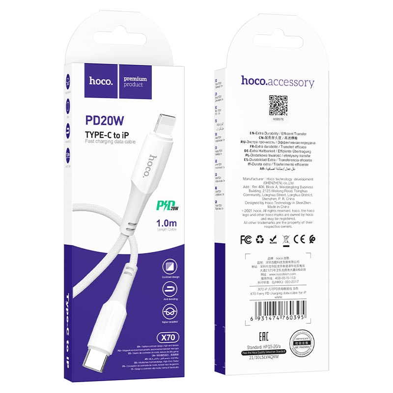 Кабель Type-C - Apple Lightning Hoco X70. белый 1м