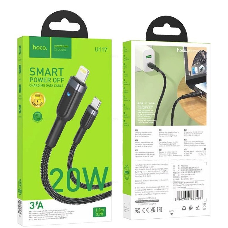 Кабель Type-C - Lightning Hoco U117 (3A, 20W, PD, с функцией интеллектуального отключения, индикатор, оплетка нейлон, 1.2 м) Черный