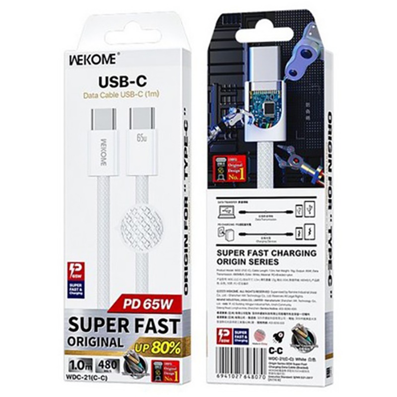 Кабель Type-C - Type-C WEKOME WDC-21 1m PD 65W Нейлон Белый