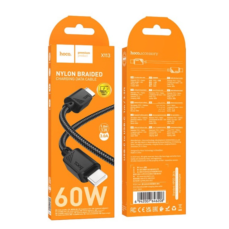 Кабель Type-C - Type-C HOCO X113 (60W/3A/1m/текстиль) черный