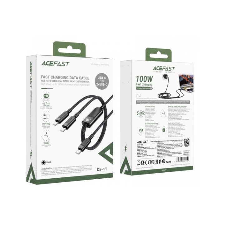 Кабель Type-C - 2xType-C ACEFAST C5-11, 1.2м, ткань, 3.0А, ткань, 2 в 1 , 100W, цвет: чёрный (1/24/192)