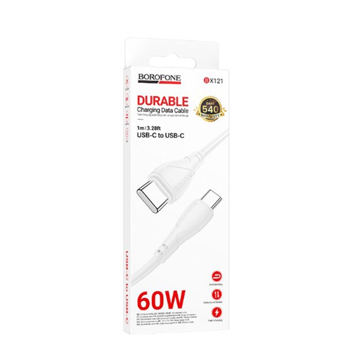 Кабель Type-C - Type-C Borofone BX121 Energy, 1.0м, круглый, PD60Вт, ПВХ, цвет: белый упакован (1/360)