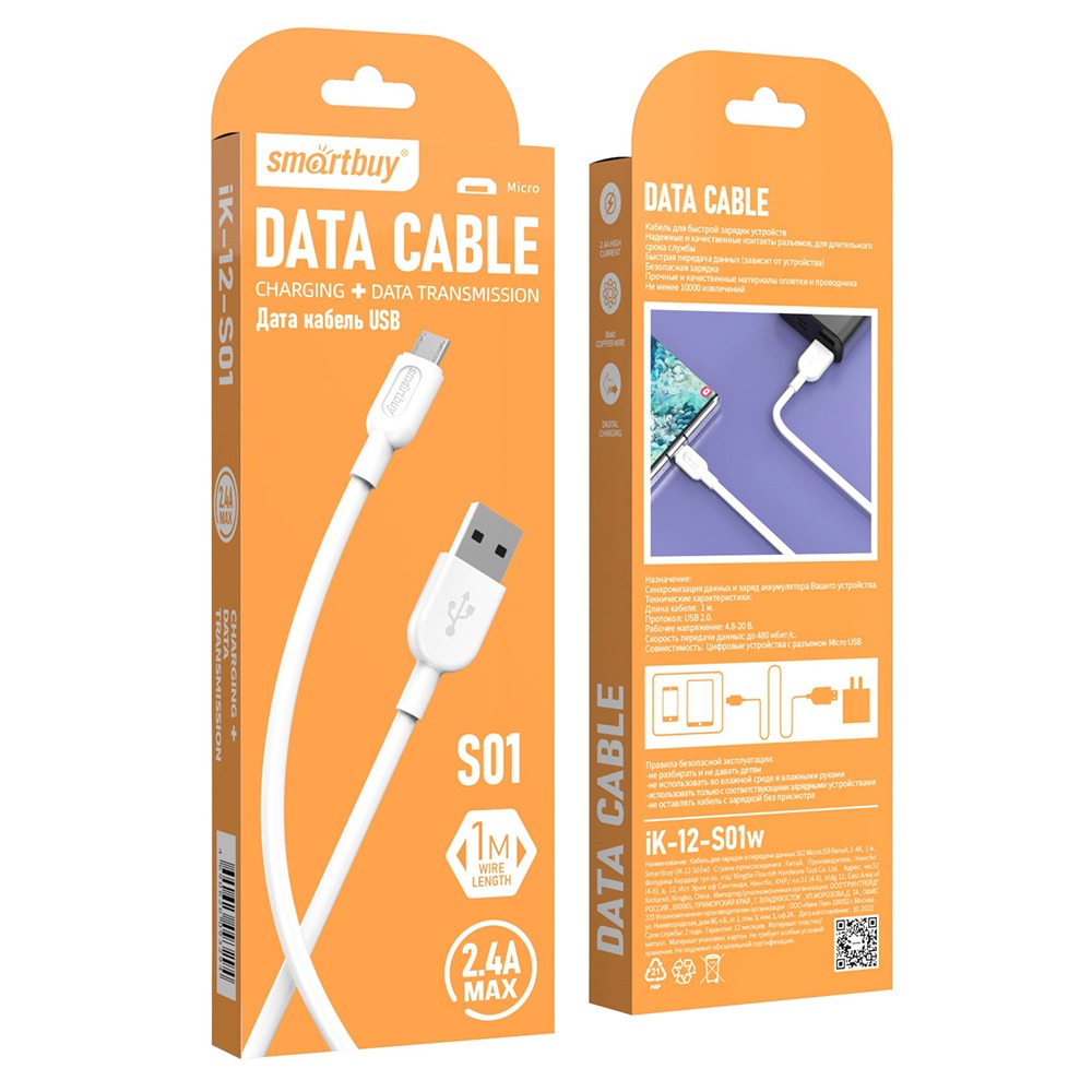 Кабель для зарядки и передачи данных S01 MicroUSB белый, 2.4А, 1 м, Smartbuy (iK-12-S01w)