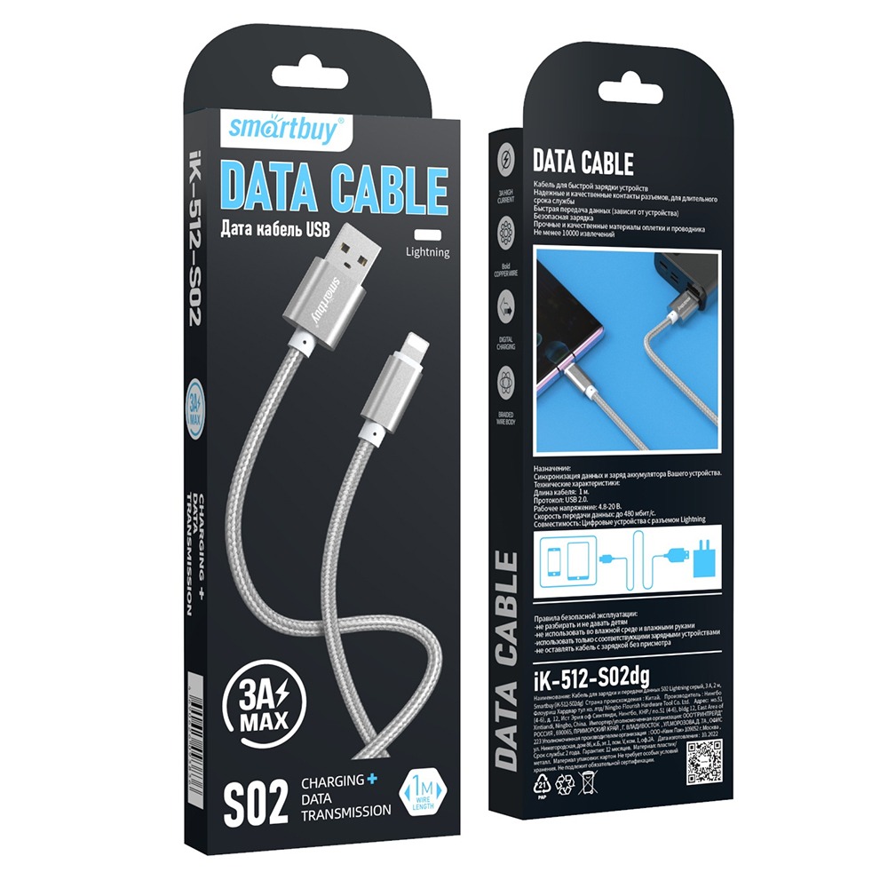 Кабель для зарядки и передачи данных S02 Lightning серый, 3 А, 1 м, Smartbuy (iK-512-S02dg)