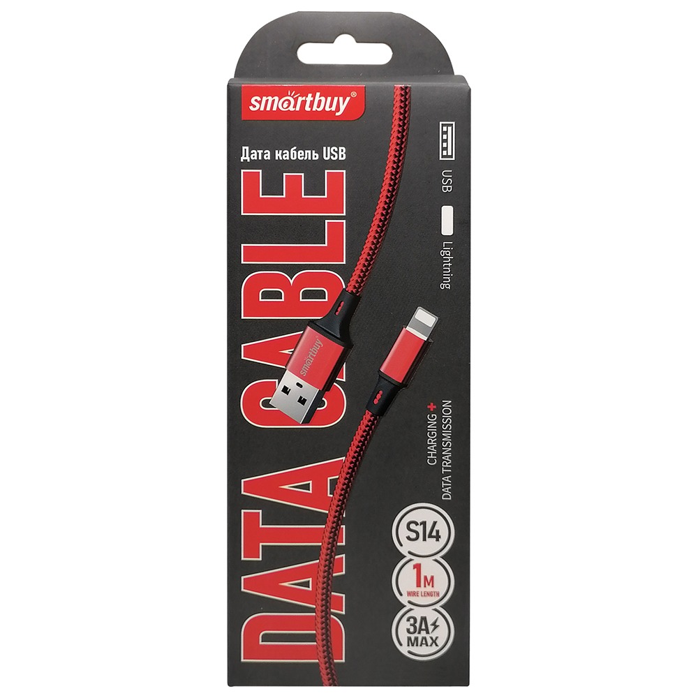 Кабель для зарядки и передачи данных S14 Lightning красный/черн., 3 А, 1 м, Smartbuy (iK-512-S14rb)
