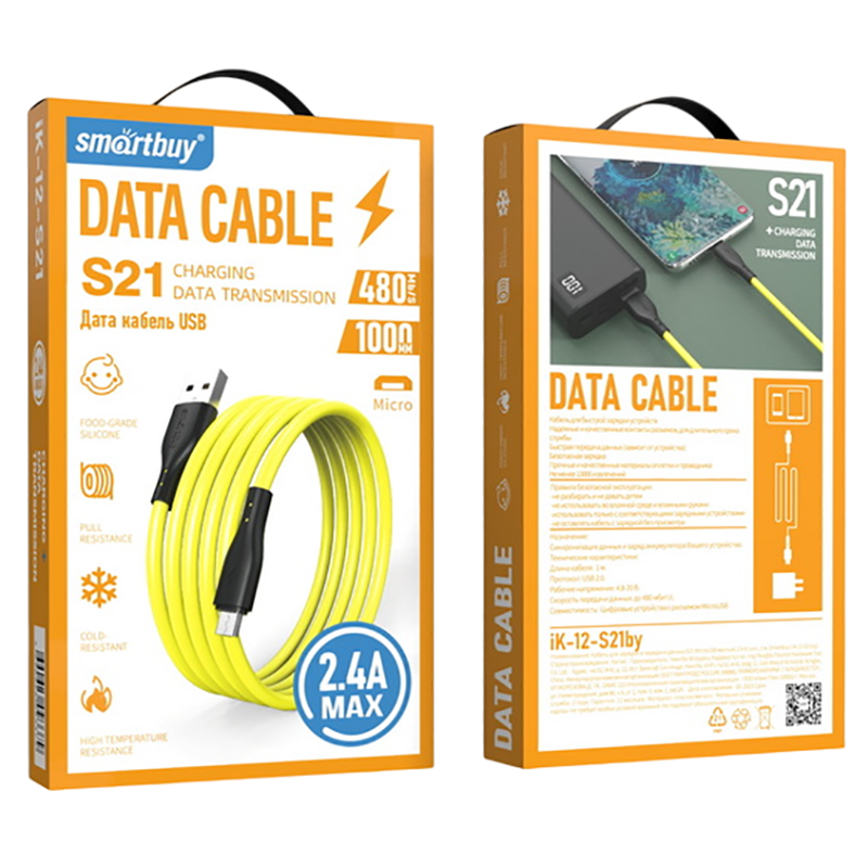 Кабель для зарядки и передачи данных S21 MicroUSB желтый, 2.4 А, сил., 1 м, Smartbuy (iK-12-S21by)