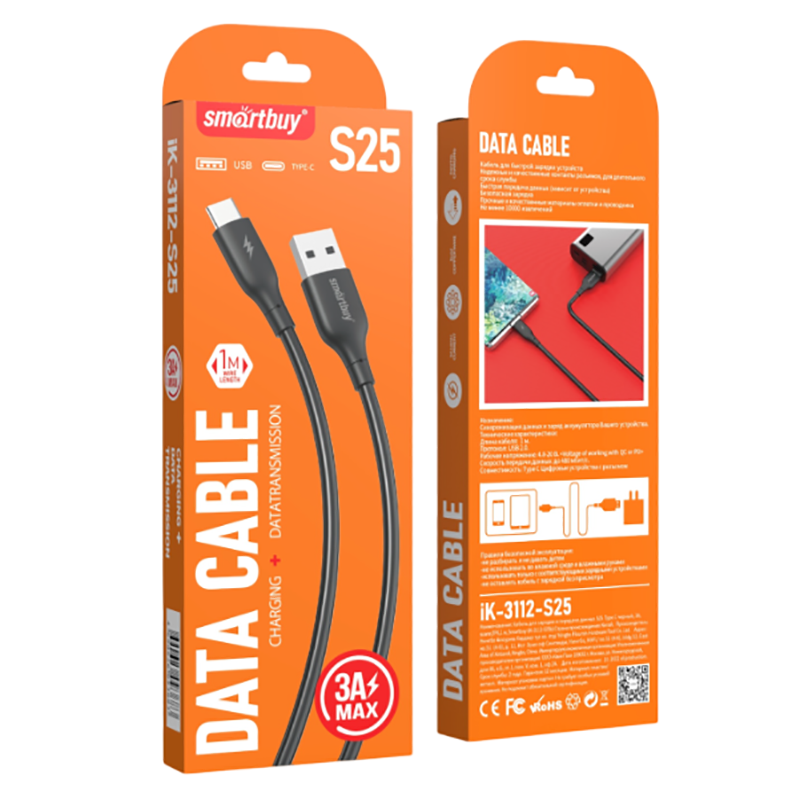Кабель для зарядки и передачи данных S25 Type C черный, 3А, soarer,TPE,1 м, Smartbuy (iK-3112-S25b)