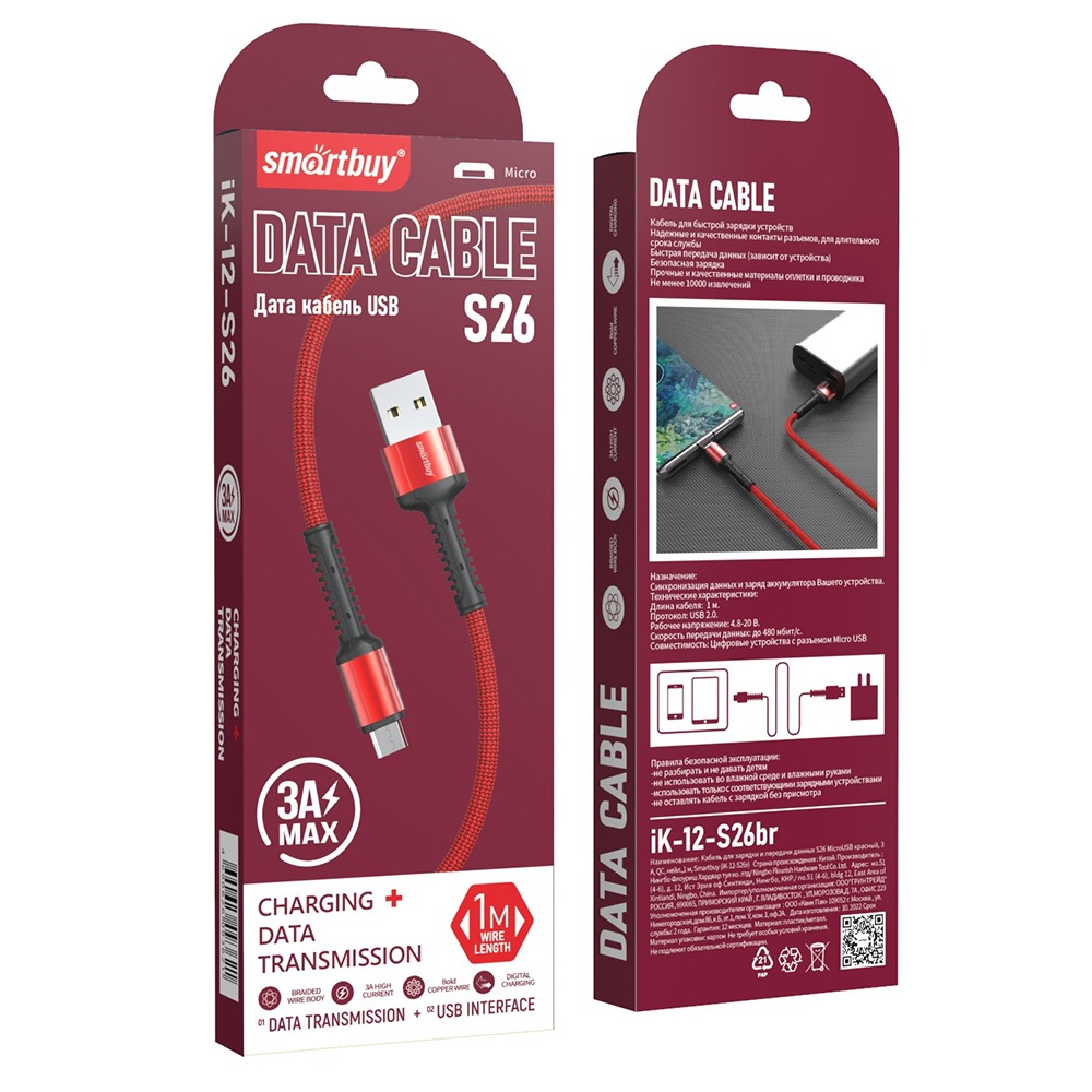 Кабель для зарядки и передачи данных S26 MicroUSB красный, 3 А, QC, нейл.,1 м, Smartbuy (iK-12-S26r)