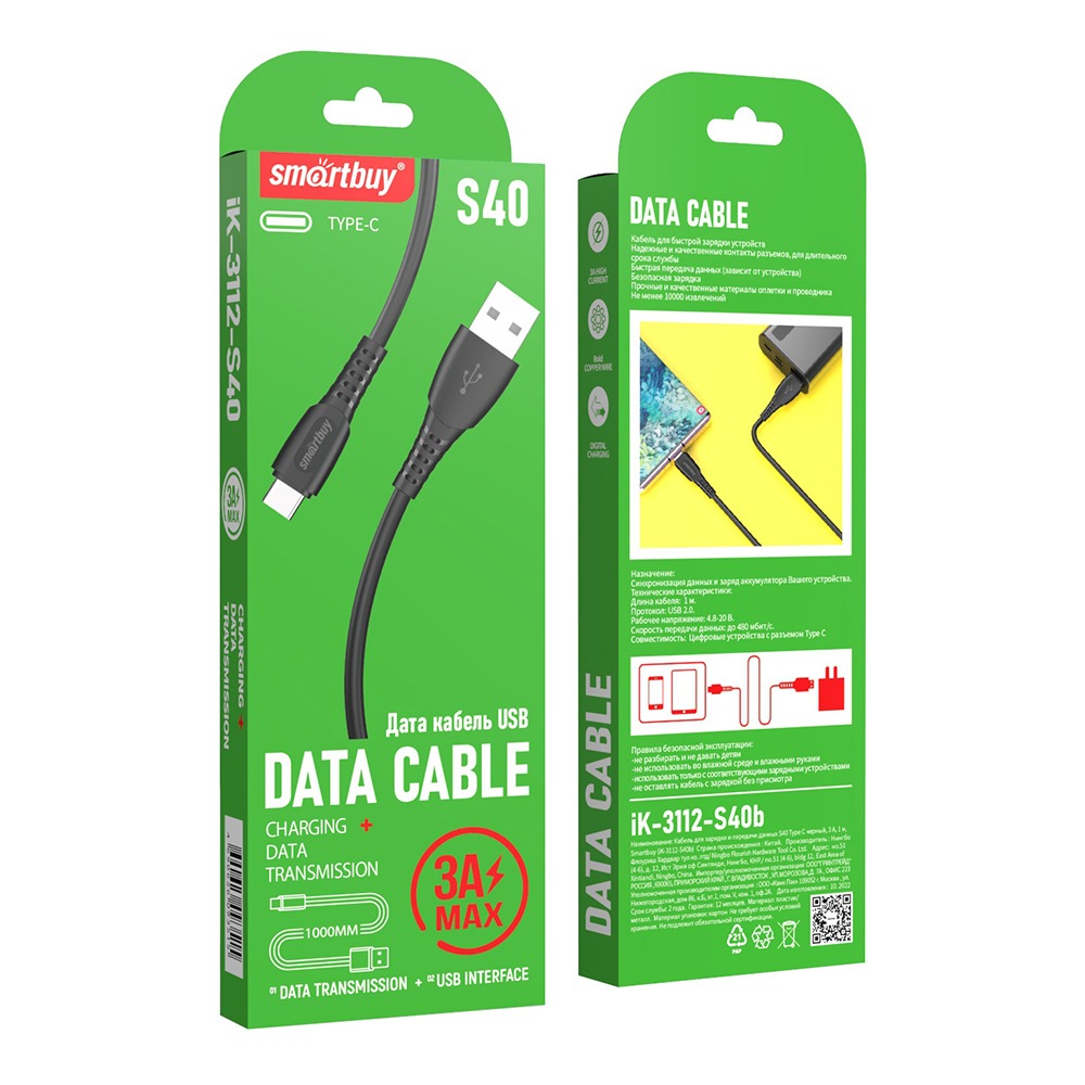 Кабель для зарядки и передачи данных S40 Type C черный, 3 А, 1 м, Smartbuy (iK-3112-S40b)