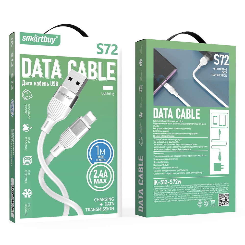 Кабель для зарядки и передачи данных S72 Lightning белый, 2.4 А, сил., 1м, Smartbuy (iK-512-S72w)