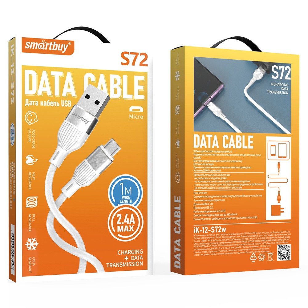 Кабель для зарядки и передачи данных S72 MicroUSB белый, 2.4 А, сил., 1м, Smartbuy (iK-12-S72w)