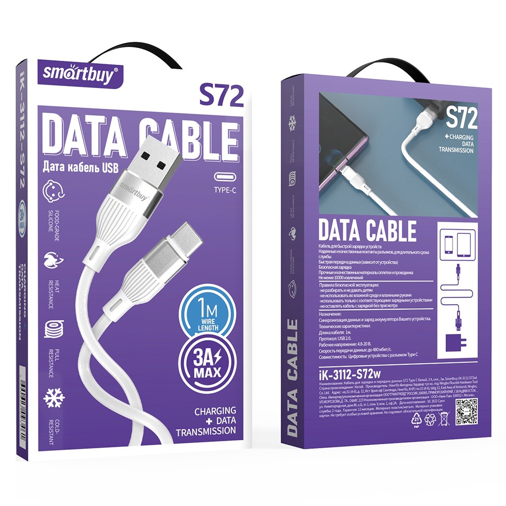 Кабель для зарядки и передачи данных S72 Type C белый, 3 А, сил., 1м, Smartbuy (iK-3112-S72w)
