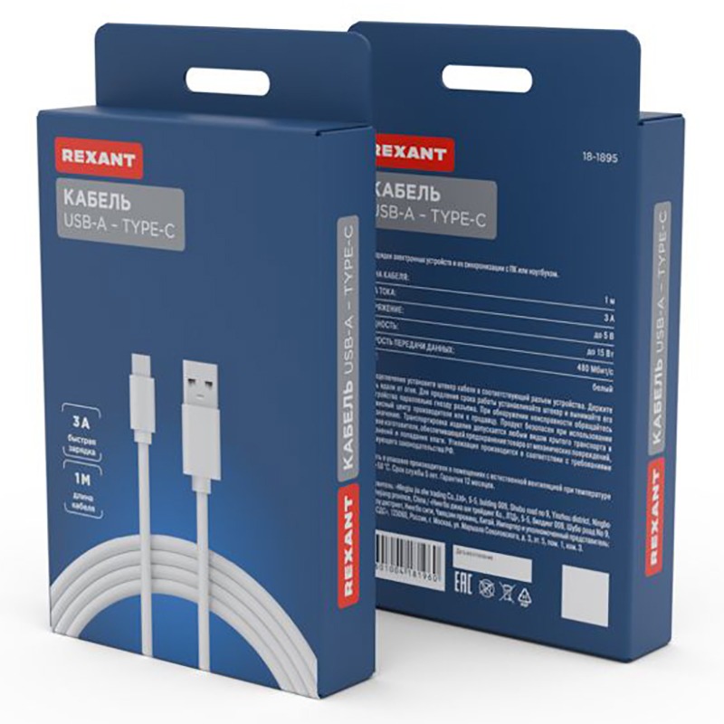 USB кабель шт.USB-A - шт.Type-C 1м, 3,0A 15W, ПВХ, белый "Rexant"