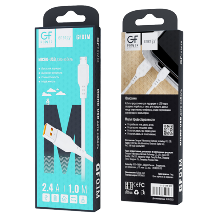 Кабель GFPower 01M USB (m)-microUSB (m) 1м 2.4A ПВХ белый (1/200/800)