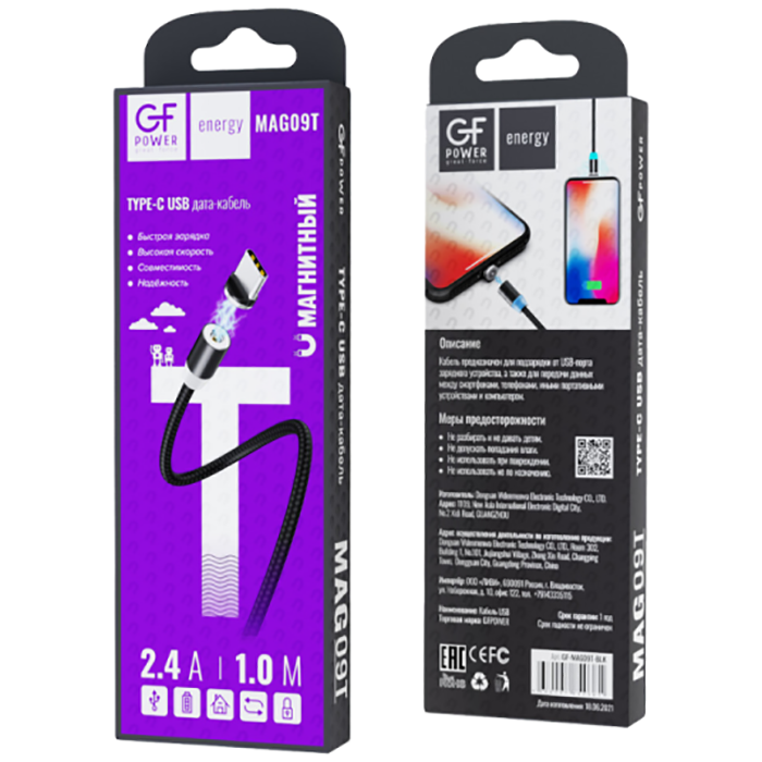 Кабель GFPower MAG09T USB (m)-Type-C (m) 1м 2.4A нейлон магнит черный (1/200/800)