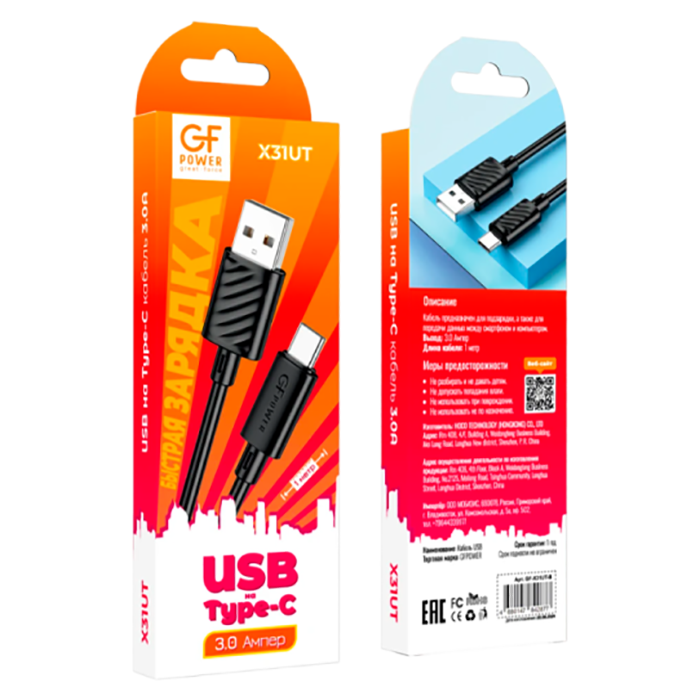 Кабель GFPower X31UT USB (m)-Type-C (m) 1м 3.0A ПВХ черный (1/30/420)