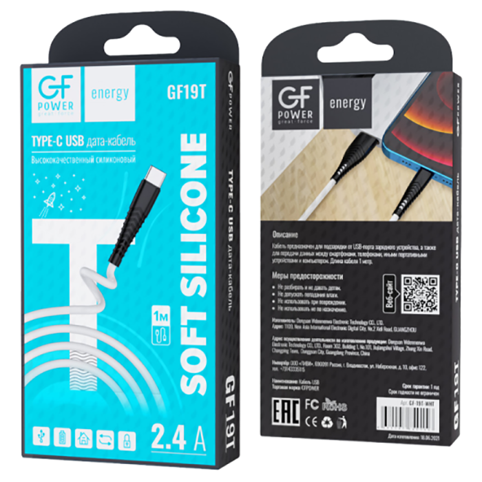 Кабель GFPower 19T USB (m)-Type-C (m) 1м 2.4A силикон белый (1/120/480)