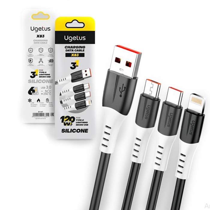 Кабель USB UGETUS X83 3 в 1 для iPhone/Micro/Type C (черный) 1.2m