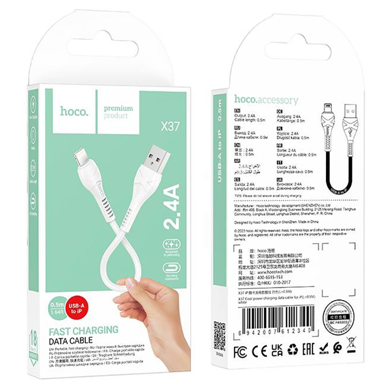 Кабель USB - 8 pin HOCO X37 Cool power, 0.5м, круглый, 2.4A, силикон, цвет: белый (1/54/540)