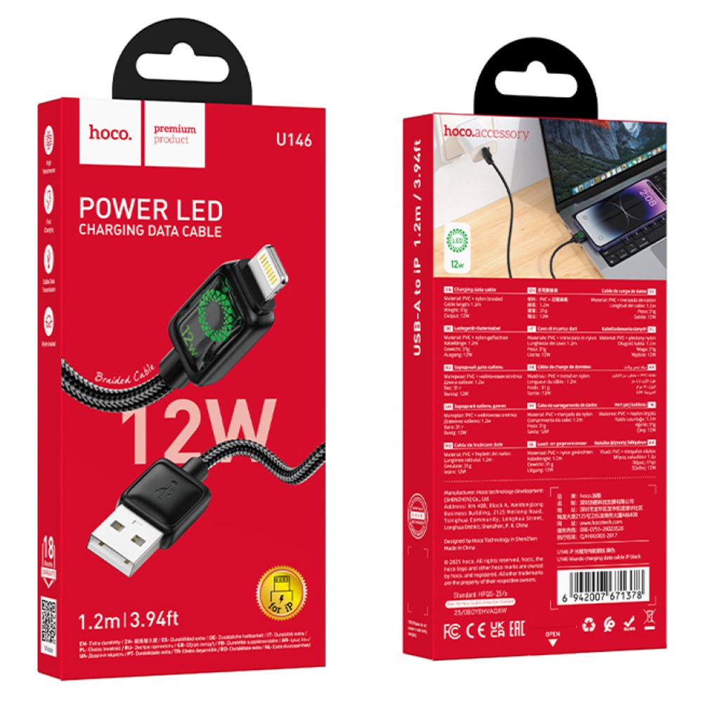 Кабель USB - Lightning Hoco U146 (12W, оплетка нейлон, 1.2 м) Черный