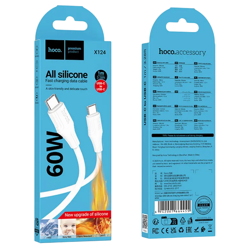 Кабель Type-C - Type-C HOCO X124 Bien, 1.0м, круглый, PD60Вт, 3.0А, силикон, цвет: белый (1/31/310)