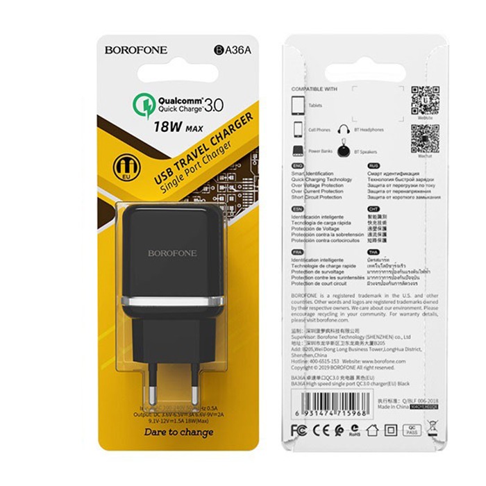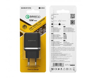 Адаптер Сетевой Borofone BA36A High QC3.0 1USB/5V/3A (black)