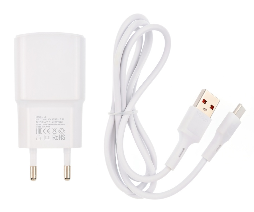 Описание СЗУ VIXION L5c (1-USB/2.1A) + Type-C кабель 1м (белый)