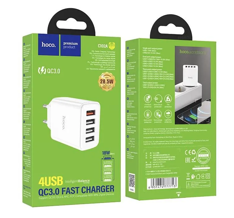 Hoco C102A технология быстрой зарядки, 4-USB выхода, вилка EU, поддержка QC3.0 / QC2.0, многоуровневая защита.