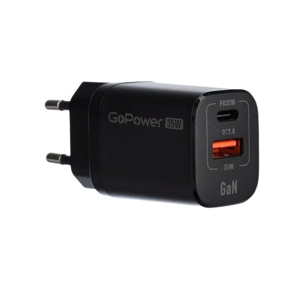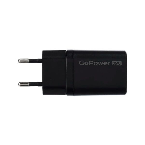 Адаптер постоянного тока 220В с выходом 1гн.QC3.0 + гн.Type-C PD 35Вт, GAN, чёрный GPQC09 "GoPower"