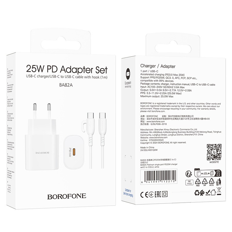 Адаптер сетевой BOROFONE BA82A PD25W +кабель Type-C/Type-C (белый)