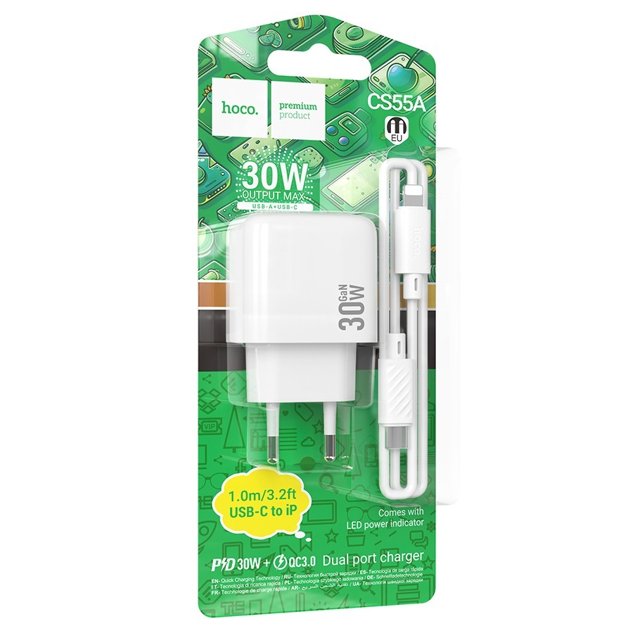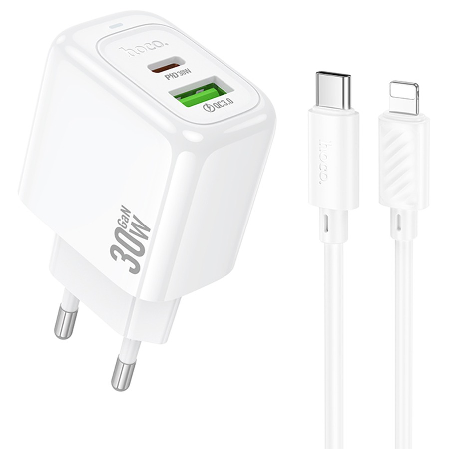СЗУ с выходом USB Hoco CS55A (PD30W/QC/1USB C/1USB/кабель Type-C - Lightning) белое
