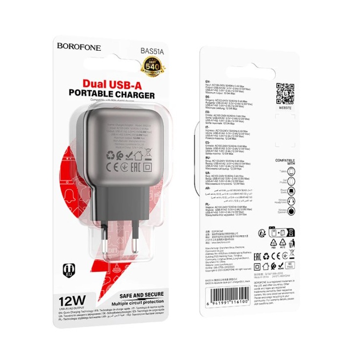 Адаптер сетевой BOROFONE BAS51A (2USB/2.4A/12W) черный
