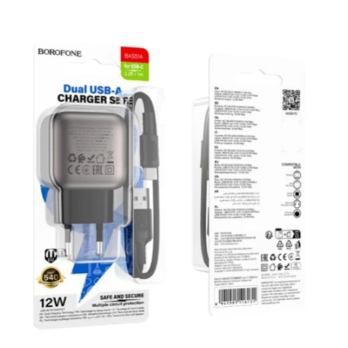 Сетевое ЗУ BOROFONE BAS51A + кабель Type-C (USB/12W/2.4A) черное